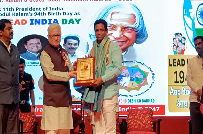 కొత్తపల్లి, అక్టోబరు 15 (విజయ క్రాంతి): అల్ఫోర్స్ విద్యాసంస్థల అధినేత డాక్టర్ వి నరేందర్ రెడ్డి బుధవారం హైదరాబాద్ లో రాష్ట్ర గవర్నర్ జిష్ణుదేవ్ వర్మ చేతుల మీ దుగా అత్యుత్తమ ఉపాధ్యాయుని అవార్డును స్వీకరించారు.