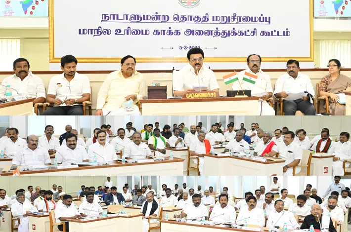 చెన్నై,(విజయక్రాంతి): లోక్ సభ నియోజకవర్గాల పునర్విభజన(Redistribution of Lok Sabha Constituencies)పై తమిళనాడు ముఖ్యమంత్రి స్టాలిన్(Tamil Nadu Chief Minister Stalin) అధ్యక్షతన అఖిలపక్ష భేటీ బుధవారం జరిగింది. ఈ అఖిలపక్ష భేటీకి డీఎంకే, అన్నాడీఎంకే, మరికొన్ని పార్టీ హాజరయ్యాయి. ఈ సందర్భంగా స్టాలిన్ మాట్లాడుతూ... లోక్ సభ నియోజకవర్గాల పునర్విభజనకు తము వ్యతిరేకం కాదని, ప్రస్తుత జనాభా ప్రకారం పునర్విభజన చేస్తే దక్షిణాదికి నష్ట వాటిలితుందని పేర్కొన్నారు. కేంద్ర ప్రభుత్వం డీలిమిటేషన్ చేస్తే 1971 జనాభా లెక్కల ప్రకారం ఎంపీ స్థానాలకు పునర్విభజన చేసి 30 ఏళ్లు అమలులో ఉంచాలని డిమాండ్ చేశారు. ఈ విషయంపై పార్లమెంటులో హామీ ఇవ్వాలని కేంద్ర ప్రభుత్వాన్ని కోరారు. కుటుంబ నియంత్రణ అమలు చేసిన రాష్ట్రాలను శిక్షించడం తగదన్నారు.