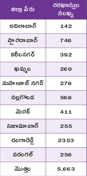 మరోపక్క మద్యం షాపులకు కేటాయించిన రిజర్వేషన్ల మేరకు గౌడ్ ఎస్సీ, ఎస్టీ అభ్యర్థులు పోటీ పడుతున్నారు. గౌడ షాపులకు 671 దరఖాస్తులు, ఎస్సీ రిజర్వేషన్లు 202, ఎస్టీ రిజర్వేషన్లు 84, జనరల్లో 4,686 దరఖాస్తులు వచ్చాయి. ఇదే రీతిలో ఉమ్మడి జిల్లాల వారీగా ఈ కింది విధంగా దరఖాస్తులు వచ్చాయని దరఖాస్తులు వచ్చినట్లు అధికారులు వెల్లడించారు.