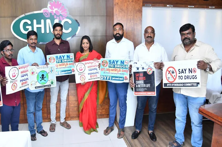 జీహెచ్ఎంసీ కార్యాలయంలో భారత ప్రజాతంత్ర యువజన సమాఖ్య(డీవైఎఫ్ఐ) హైదరాబాద్ సెంట్రల్ సిటీ కమిటీ ఆధ్వర్యంలో ‘మాదకద్రవ్యాలను నిర్మూలిద్దాం సమాజాన్ని కాపాడుకుందాం’ పోస్టర్ను సోమవారం మేయర్ గద్వాల విజయలక్ష్మివిడుదల చేసి, సంతకాల సేకరణను ప్రారంభించారు. విద్యార్థులు, యువత మాదకద్రవ్యాలకి దూరంగా ఉండాలని సూచించారు. గంజాయి, డ్రగ్స్కు అడ్డుకట్ట వేయాలని డీవైఎఫ్ఐ జిల్లా కార్యదర్శి ఎండీ జావీద్ అన్నారు. కార్యక్రమంలో డీవైఎప్ఐ నాయకులు కోట రమేష్, అనగంటి వెంకటేష్, దామోర హష్మీబాబు పాల్గొన్నారు.