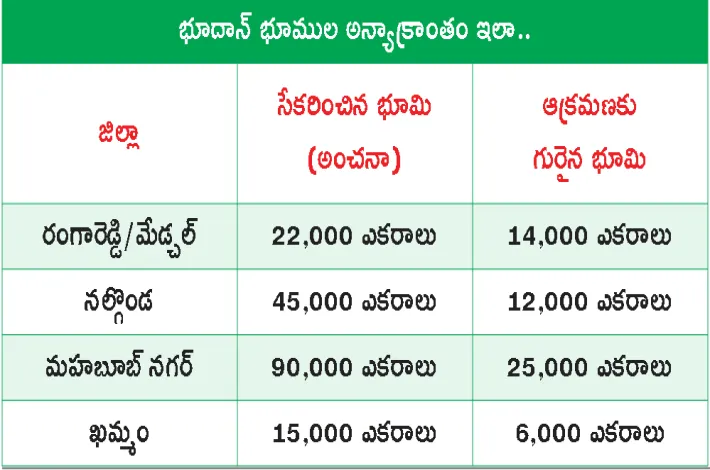 ఆక్రమణల నుంచి విడిపించిన భూములను నిరుపేదలకు, దళిత, గిరిజన కుటుంబాలకు పంచాలన్నారు. రాష్ట్రవ్యాప్తంగా ఉన్న భూదాన్ భూముల రక్షణ కోసం బాధితులందరినీ ఏకం చేసి ’చలో అసెంబ్లీ’ నిర్వ హిస్తామని హెచ్చరించారు. రాష్ట్రవ్యాప్తంగా 1.82 లక్షల ఎకరాల భూమిలో కేవలం 1.14 లక్షల ఎకరాలే పంచారని, మిగిలిన 68 వేల ఎకరాల భూమి ఏమైందని ప్రశ్నించారు. ‘హైదరాబాద్ చుట్టూ ఉన్న రంగారెడ్డి జిల్లాలో 21వేల ఎకరాల భూదాన్ భూమి ఉంటే, అందులో 13వేల ఎకరాలు ఆక్రమణకు గురైనట్టు రిపోర్టులు చెపుతున్నాయని వివరించారు. దీనిపై ప్రభుత్వం ఎందుకు మౌనంగా ఉన్నదని ప్రశ్నించారు.