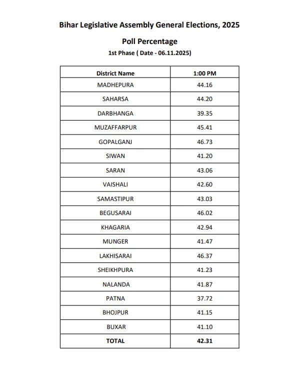 పాట్నా: బీహార్ అసెంబ్లీ తొలి విడత ఎన్నికల పోలింగ్ ప్రశాంతంగా కొనసాగుతోంది. బీహార్ అసెంబ్లీ ఎన్నికల మొదటి దశలో 3.75 కోట్ల మంది ఓటర్లలో మొత్తం 42.31 శాతం(Bihar Assembly Election Voting percentage) మంది మధ్యాహ్నం 1 గంట వరకు తమ ఓటు హక్కును వినియోగించుకున్నారు. గోపాల్గంజ్ జిల్లాలో ఇప్పటివరకు అత్యధిక పోలింగ్ శాతం 46.73గా నమోదైంది. తరువాత లఖిసరాయ్ 46.37 శాతం, బెగుసరాయ్ 46.02 శాతం పోలింగ్ నమోదైంది. ఉన్నాయి. అధికార ఎన్డీఏకు అగ్నిపరీక్షగా భావించే అత్యంత ప్రతిష్ఠాత్మక అసెంబ్లీ ఎన్నికల మొదటి దశలో ముఖ్యమంత్రి నితీష్ కుమార్, ఇండియా బ్లాక్ ముఖ్యమంత్రి అభ్యర్థి తేజస్వి యాదవ్ తమ ఓటు హక్కు వినియోగించుకుని అందరూ ఓటేయాలని పిలుపునిచ్చారు.