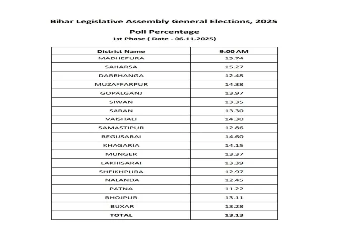 పాట్నా: బీహార్లోని 121 అసెంబ్లీ స్థానాలకు గురువారం ఉదయం తొలి దశ అసెంబ్లీ ఎన్నికల పోలింగ్ గట్టి భద్రతా ఏర్పాట్ల మధ్య ప్రారంభమై కొనసాగుతోంది. బీహార్ తొలి దశ ఎన్నికల్లో ఉదయం 9 గంటల వరకు 13.13 శాతం పోలింగ్(Bihar first phase voting percentage) నమోదైంది. మొదటి దశ పోలింగ్ ప్రారంభమైన మొదటి రెండు గంటల్లో 3.75 కోట్ల మంది ఓటర్లలో మొత్తం 13.13 శాతం(Bihar Election 2025 Phase 1 voting) మంది తమ ఓటు హక్కును వినియోగించుకున్నారని ఎన్నికల అధికారులు తెలిపారు. సహర్సాలో ఇప్పటివరకు అత్యధిక పోలింగ్ శాతం 15.27గా నమోదైంది. ఆ తర్వాత బెగుసరాయ్ (14.6), ముజఫర్పూర్ (14.38)శాతంగా నమోదైంది. ఆర్జేడీ నాయకుడు, ఇండియా బ్లాక్ ముఖ్యమంత్రి అభ్యర్థి తేజస్వి యాదవ్, కేంద్ర మంత్రులు గిరిరాజ్ సింగ్, రాజీవ్ రంజన్ సింగ్ 'లాలన్', బీహార్ ఉప ముఖ్యమంత్రి విజయ్ కుమార్ సిన్హా సహా పలువురు సీనియర్ రాజకీయ నాయకులు ముందుగా ఓటు వేసిన వారిలో ఉన్నారు.