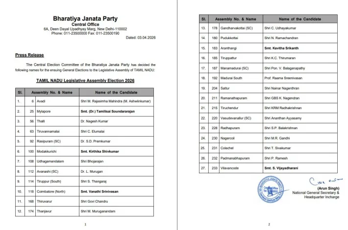 భారతీయ జనతా పార్టీ కేంద్ర ఎన్నికల కమిటీ, తమిళనాడు శాసనసభకు జరగనున్న సాధారణ ఎన్నికల కోసం కింది పేర్లను ఖరారు చేసింది.