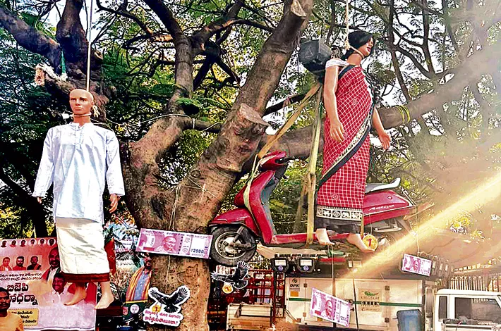 బిల్లులు రాక సర్పంచ్ల ఆత్మహ త్యలు, యువతులకు స్కూటీలివ్వ డం, మహిళలకు రూ.2500 పింఛన్ అమలు, కళ్యాణ లక్ష్మి కింద తులం బంగారం ఇస్తామని కాంగ్రెస్ ఇచ్చిన హామీలు ఈ రెండేళ్ల పాలనలో అమలు కాలేదని తెలిపేలా వినూత్నంగా నిరసన కార్యక్రమాన్ని చేపట్టింది. ఉరి వేసుకున్నట్లుగా బొమ్మలను చెట్టుకు వేలాడదీశారు.