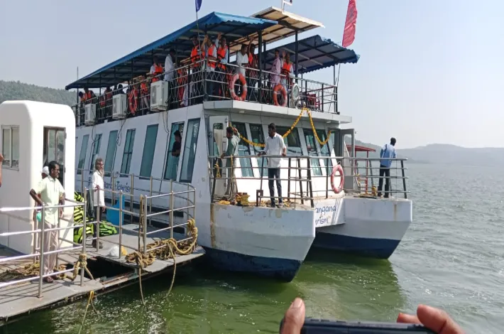 కొల్లాపూర్ రూరల్: నాగర్ కర్నూల్ జిల్లా(Nagarkurnool District) కొల్లాపూర్ మండలం సోమశిల వీఐపీ పుష్కర ఘాట్(Somasila VIP Pushkara Ghat) వద్ద శనివారం సోమశిల నుండి శ్రీశైలం(Somasila to Srisailam) క్షేత్రానికి కృష్ణా నది మీదుగా తెలంగాణ టూరిజం లాంచీ ప్రయాణన్ని అధికారులు మరోసారి ప్రారంభించారు. పర్యాటక శాఖ అధికారి కల్వరాల నరసింహ, సర్కిల్ ఇన్స్పెక్టర్ మహేష్, ఎస్సై హృషికేష్ పూజలు చేసి లాంచీని ప్రారంభించారు. హైదరాబాద్, విశాఖ ప్రాంతాల నుంచి వచ్చిన 65 మంది పర్యాటకులు నల్లమల కొండల మధ్య కృష్ణమ్మ ఒడిలోని ప్రకృతి అందాలను ఆస్వాదిస్తూ లాంచి ప్రయాణం చేశారు. సోమశిల నుంచి శ్రీశైలం వరకు లాంచీ పునఃప్రారంభం కావడంతో కృష్ణా తీరం పర్యాటకులతో కిక్కిరిసింది. ఈ కార్యక్రమంలో టూరిజం యూనిట్ ఇన్చార్జి ప్రేమ్ కుమార్, డిప్యూటీ మేనేజర్ ప్రభుదాస్, మాజీ సర్పంచ్ బింగి మద్దిలేటి, టూరిజం పోలీస్ సిబ్బంది పాల్గొన్నారు.