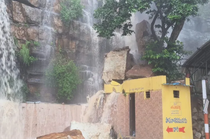 భారీ కొండ చరియలు(landslides ) మెట్ల దగ్గర ఉన్న స్నానపు గదులపై పడడంతో పూర్తిగా ధ్వంసమైంది. ఎడతెరిపిలేని వర్షాల వలన కొండ పై నుంచి భారీగా నీటి ధార కిందకు దూకుతోంది. ఆలయ పరిసరాలు ప్రమాదకరంగా మారడంతో భక్తుల రాకను నిలిపివేశారు. కొండపైన ఉన్న సిబ్బందిని సైతం ట్రాక్టర్ సాయంతో కిందికి తీసుకొచ్చినట్లు ఆలయ ధర్మకర్తల మండలి చైర్మన్ బీరం మాధవరెడ్డి తెలిపారు. వర్షాలు తగ్గుముఖం పట్టే వరకు భక్తులెవరు ఆలయం వద్దకు రావద్దని ఆయన కోరారు.