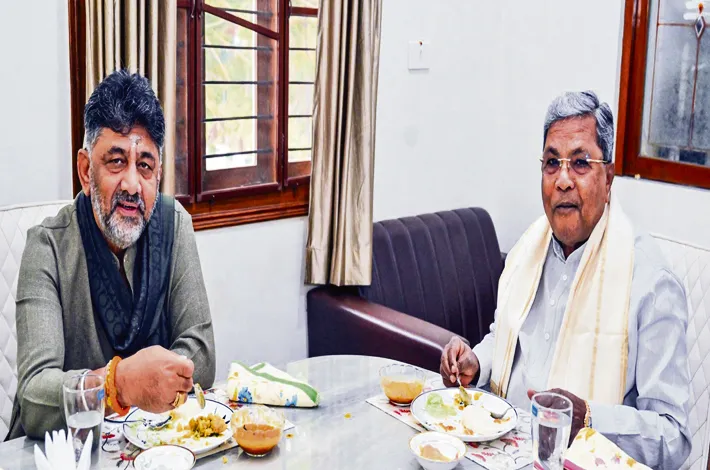 బెంగళూరు, నవంబర్ 29: కర్ణాటక ముఖ్యమంత్రి సిద్ధరామయ్య, ఉప ముఖ్యమంత్రి డీకే శివకుమార్ మధ్య నివురుగప్పిన నిప్పులా సాగుతున్న అధికార పోరుకు తా త్కాలికంగా తెరపడింది. కాంగ్రెస్ అధిష్ఠానం ‘బ్రేక్ఫాస్ట్’ రాజకీయం ఫలించింది. సీఎం సిద్ధరామయ్య ఆహ్వానం మేర కు శనివారం ఉదయం బెంగళూరులోని సిద్ధరామయ్య ఇంటికి డీకే శివకుమార్ విచ్చేశారు.