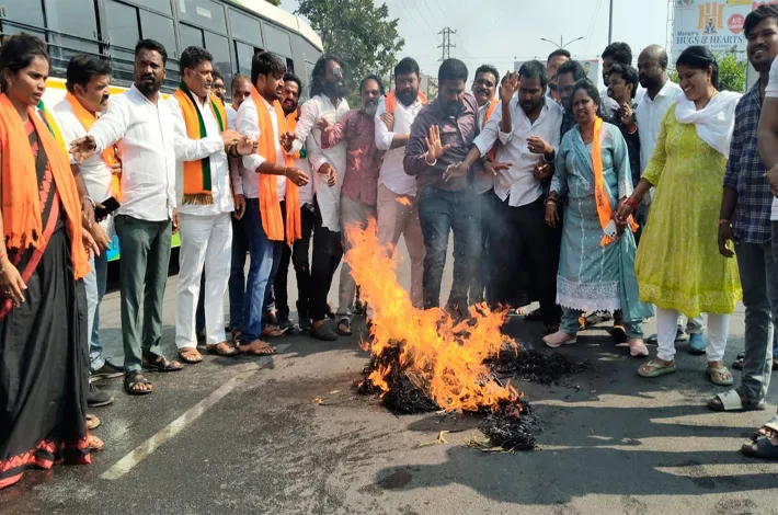 ముకరంపుర, డిసెంబరు 3 (విజయ క్రాంతి): ముఖ్యమంత్రి రేవంత్ రెడ్డి హిందూ దేవతలపై చేసిన వ్యాఖ్యలకు నిరసనగా బిజెపి జిల్లా శాఖ ఆధ్వర్యంలో బుధవారం తెలంగాణ చౌక్ లో సీఎం దిష్టిబొమ్మ దహనం చేశారు. సందర్భంగా బిజెపి జిల్లా అధ్యక్షుడు గంగాడి కృష్ణారెడ్డి మాట్లాడుతూ ముఖ్యమంత్రి రేవంత్ రెడ్డి రాజకీయాలే పరమావధిగా జీవిస్తున్నారని , తన రాజకీయ అవసరాల కోసం ఇతర మతాల మెప్పుకోసం హిందూ దేవుళ్లను ద్వేషిస్తూ, హేళనగా మాట్లాడిన సీఎం రేవంత్ రెడ్డి బేషరతుగా హిందూ సమాజానికి క్షమాపణ చెప్పాలని డిమాండ్ చేశారు.