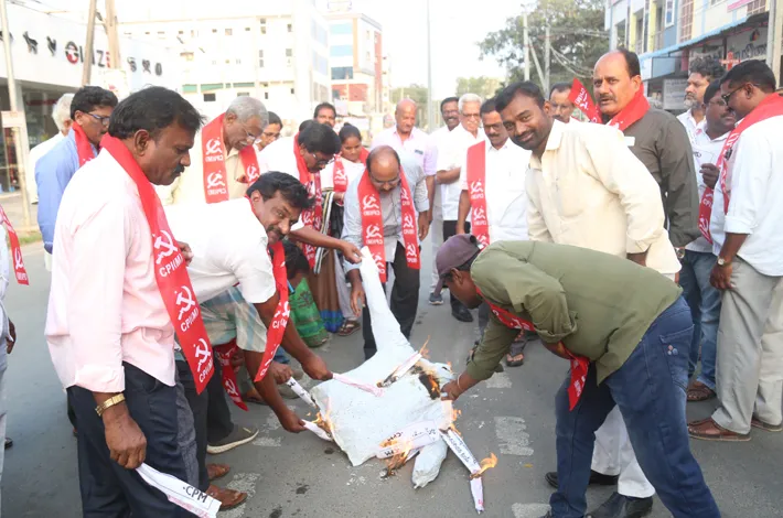 ఖమ్మం (విజయక్రాంతి): భారతీయులకు సంకెళ్ళు వేసి, ఇండియాకు విమానంలో తరలించి, అవమానించడాన్ని నిరసిస్తూ శుక్రవారం ఖమ్మం జిల్లా వ్యాప్తంగా నిరసనలు కొనసాగాయి. ఈ సందర్బంగా ఖమ్మంలో సీపీఎం, సీపీఐ ఎంఎల్ మాస్ లైన్ పార్టీల నేతృత్వంలో ట్రంప్ దిష్టిబొమ్మను ఊరేగించి, దహనం చేశారు. సీపీఎం ఆధ్వర్యంలో ఖమ్మంలోని ఎన్ఎస్పి క్యాంప్ ప్రధాన రహదారిపై ట్రంప్ దిష్టి బొమ్మను దహనం చేశారు. అలాగే సీపీఐ ఎంఎల్ మాస్ లైన్ నేతృత్వంలో కాకతీయ యూనివర్శిటీ కాలేజీ క్యాంపస్లో వినూత్నగా తలకు ట్రంప్ మాస్క్ ధరించి, చేతికి సంకేళ్లు వేసుకుని, వినూత్నరీతిలో నిరసన తెలియజేశారు. అనంతరం ట్రంప్ దిష్టిబొమ్మను దహనం చేశారు.