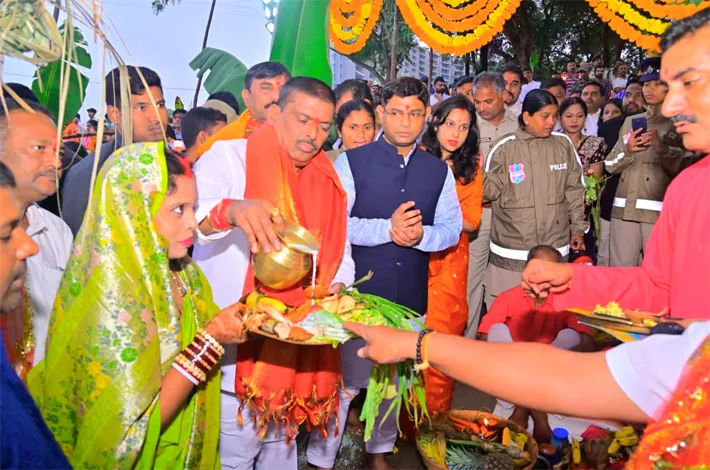 పటాన్చెరు, అక్టోబర్ 28 : ఉత్తర భారతీయులు అత్యంత భక్తిశ్రద్ధలతో సూర్య భగవానుడిని ఆరాధిస్తూ నిర్వహించుకునే ఛట్ పూజ ఉపవాస దీక్షల ముగింపు కార్యక్రమంలో పటాన్చెరు ఎమ్మెల్యే గూడెం మహిపాల్ రెడ్డి ముఖ్య అతిథిగా పాల్గొన్నారు. సోమవారం సాయంత్రం పటాన్చెరు పట్టణంలోని సాకి చెరువు కట్టపై సూర్య అస్తమయం నుండి ఉపవాస దీక్షలతో ప్రారంభమైన ఛట్ పూజ కార్యక్రమాలు మంగళవారం ఉదయం సూర్యోదయంతో సూర్య భగవానుడుని ఆరాధిస్తూ ఘనంగా ముగిసాయి.