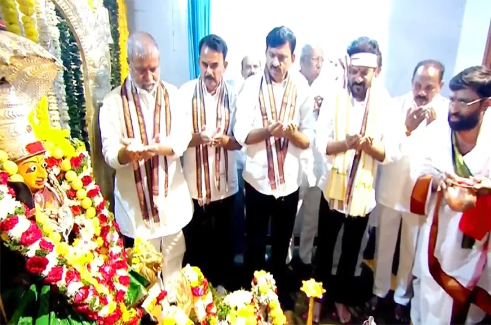 పోలేపల్లి,(విజయక్రాంతి): తెలంగాణ ముఖ్యమంత్రి రేవంత్ రెడ్డి(Telangana Chief Minister Revanth Reddy) శుక్రవారం వికారాబాద్ జిల్లాలో పర్యటిస్తున్నారు. వికారాబాద్ పర్యటనలో భాగంగా రేవంత్ రెడ్డి పోలేపల్లిలో నిర్వహించే శ్రీ రేణుక ఎల్లమ్మ జాతరకు శుక్రవారం హాజరయ్యారు. శ్రీ రేణుక ఎల్లమ్మ దేవస్థానంలో అమ్మవారికి పట్టు వస్త్రాలను సమర్పించి, ప్రత్యేక పూజలు చేశారు. ఈ కార్యక్రమంలో రేవంత్ రెడ్డితో పాటు వైద్య ఆరోగ్యశాఖ మంత్రి దామోదర రాజనరసింహ, రెవెన్యూ, గృహ నిర్మాణం, సమాచార శాఖల మంత్రి పొంగులేటి శ్రీనివాసరెడ్డి, ఎక్సైజ్, పర్యాటక శాఖ మంత్రి జూపల్లి కృష్ణారావు తదితర నాయకులు పాల్గొన్నారు.