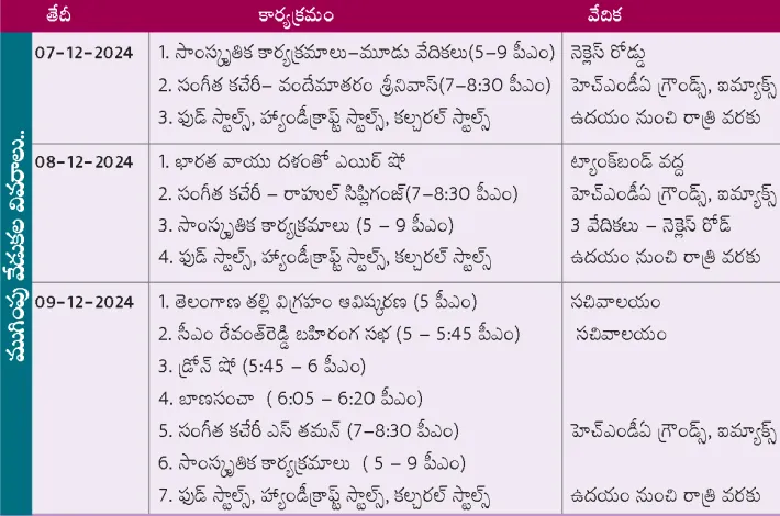 హైదరాబాద్, డిసెంబర్ 6 (విజయక్రాంతి): ప్రజాపాలన విజయో త్సవాల ముగింపు వేడుకలను డిసెంబర్ 7 నుంచి 9వ తేదీ వరకు ఘనం గా నిర్వహించాలని రాష్ట్ర ప్రభుత్వం నిర్ణయించింది. ఈ వేడుకల్లో ప్రజలు కూడా పాలు పంచుకుని సంబురాలు జరుపుకునే విధంగా అధికా రులు కార్యక్రమాలను రూపకల్పన చేశారు.