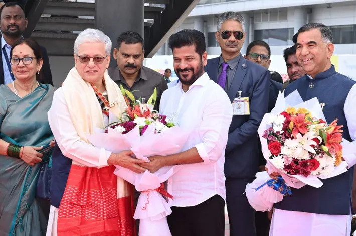 హైదరాబాద్: శంషాబాద్ విమానాశ్రయంలో తెలంగాణ నూతన గవర్నర్ జిష్ణుదేవ్ వర్మకి ముఖ్యమంత్రి రేవంత్ రెడ్డి బుధవారం స్వాగతం పలికారు. ఈ కార్యక్రమంలో ప్రభుత్వ ప్రధాన కార్యదర్శి శాంతి కుమారి, డీజీపీ జితేందర్, త్రివిధ దళాల అధికారులు, రాష్ట్ర ప్రభుత్వ సలహా దారు హర్కార వేణుగోపాల్ రావు, ఇతర ఉన్నతాధికారులు పాల్గొన్నారు.