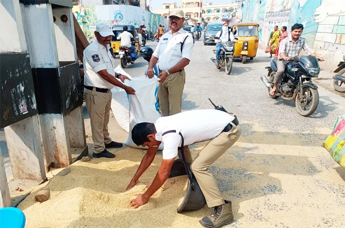రోడ్డుపై పడిన ధాన్యాన్ని వృథా కాకుండా జాగ్రత్తగా సేకరించి తిరిగి బస్తాలలో నింపి రైతుకు అందజేశారు. అంతేకాకుండా, ట్రాఫిక్ అంతరాయం కలగకుండా వాహనాలను నియంత్రిస్తూ, రోడ్డును శుభ్రపరచి సజావుగా రాకపోకలు సాగేందుకు చర్యలు తీసుకున్నారు. ఈ సందర్భంగా రైతు భూక్యా బాలాజీ ట్రాఫిక్ పోలీసుల సేవలకు కృతజ్ఞతలు తెలిపారు.