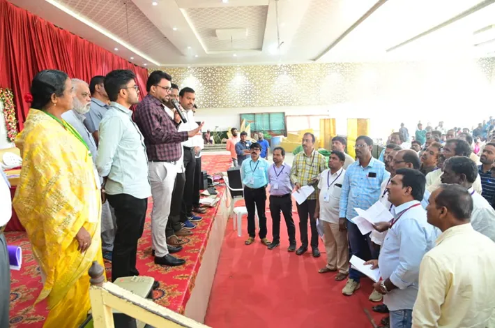 అచ్చంపేట: మరికొద్దిసేపట్లో కీలక ఘట్టానికి అంకురార్పణ జరగనుంది. గ్రామ పంచాయతిని అధిరోహించే విజేతలెవరో తేలిపోనుంది. నాగర్ కర్నూల్ జిల్లాలో చివరి విడత గ్రామ పంచాయతీ ఎన్నికలకు అధికారులు అన్ని ఏర్పాట్లు పూర్తి చేశారు. ఎన్నికల అధికారి, కలెక్టర్ బాదావత్ సంతోష్ మంగళవారం అచ్చంపేటలోని బర్కతుల్ల ఫంక్షన్ హాల్లో ఏర్పాటు చేసిన ఎన్నికల సామాగ్రి పంపిణీ కేంద్రాన్ని జిల్లా కలెక్టర్ పరిశీలించారు. ఈ సందర్భంగా ఎన్నికల నిర్వహణకు అవసరమైన ఏర్పాట్లను పరిశీలించి, సామగ్రి పంపిణీ ప్రక్రియ సక్రమంగా సాగుతున్న తీరును అధికారులను అడిగి తెలుసుకున్నారు. ఎన్నికల విధులను సమర్థవంతంగా నిర్వహించేందుకు సిబ్బంది నిబద్ధతతో పనిచేయాలని సూచించారు.