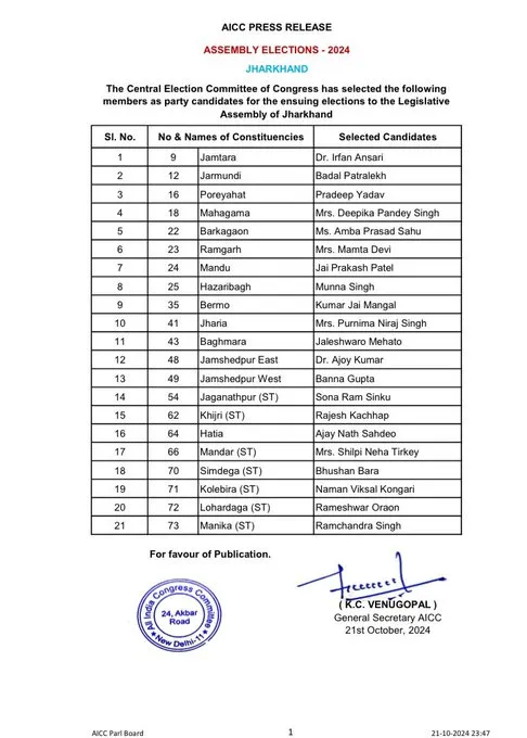 జార్ఖండ్ ఎన్నికలకు తొలి జాబితా విడుదల చేసిన కాంగ్రెస్