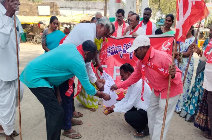 కేసముద్రం, డిసెంబర్ 19 (విజయక్రాంతి): ఉపాధి హామీ చట్టాన్ని పథకం గా మార్చి ని ర్వీర్యం చేసే కుట్రలో భాగంగానే కేంద్ర ప్రభుత్వం మహాత్మా గాంధీ పేరుతో ఉన్న నరేగా పేరును వీ బీ జీ రామ్ జీ గా మార్చిందని సీపీఎం రాష్ట్ర కార్యదర్శి వర్గ సభ్యుడు జీ.నాగయ్య ఆరోపించారు. మహబూబాబాద్ జిల్లా కేసముద్రం పట్టణంలోని గాంధీ సెంటర్ లో సిపిఎం పార్టీ మండల కార్యదర్శి గోడిశాల వెంకన్న ఆధ్వర్యంలో మహాత్మా గాంధీ గ్రామీణ ఉపాధి హామీ చ ట్టాన్ని రద్దుచేసి వీ.బీ.జీ.రామ్.జీ 2025 పథకంగా మార్చడానికి నిరసిస్తూ బిల్లు ప్రతులు దగ్ధం చేశారు ఈ కార్యక్రమంలో పాల్గొన్న నాగయ్య మాట్లాడుతూ కేంద్ర ప్రభుత్వం ఉపాధి హామీ చట్టాన్ని పథకంగా మార్చి నిర్వీర్యం చేసే కుట్రను ప్రతి ఒక్కరూ తిప్పికొట్టాలని పిలుపునిచ్చారు.