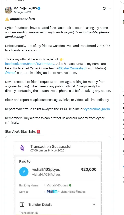 హైదరాబాద్: నా పేరుతో ఫేక్ ఫేస్బుక్ ఖాతాలు(Fake Facebook accounts) సృష్టించి, నా స్నేహితులకు 'నేను ఆపదలో ఉన్నాను. డబ్బులు పంపించండి' అని సైబర్ నేరగాళ్లు సందేశాలు పంపిస్తున్నారని హైదరాబాద్ పోలీస్ కమిషనర్ వీసీ సజ్జనార్(Sajjanar) పేర్కొన్నారు. దురదృష్టవశాత్తు, నిజమే అనుకుని నా స్నేహితుడు ఒకరు రూ. 20,000 పంపి మోసపోయారని వివరించారు. నా వ్యక్తిగత ఫేస్ బుక్ పేజీ లింక్ ఇది. https://facebook.com/share/1DHPndApWj/.