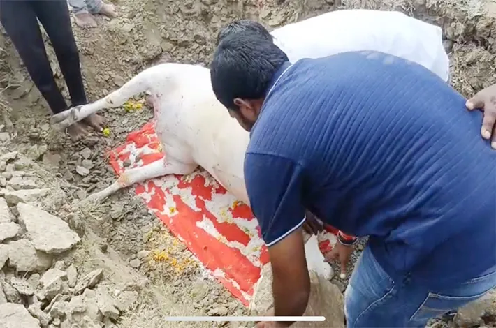 కుభీర్,(విజయాక్రాంతి): ఈ రోజు కుబీర్ గ్రామంలోని శివాజీ కాలనీలో ఉదయము 5 గంటలకు కాలనీవాసులు లేచి చూసేసరికి, లేగదూడ మృత్యువాతకు గురైందని గమనించి, ఇట్టి గోమాత ఎవరికి చెందినదో తెలుసుకోవడానికి పలు వాట్సాప్ గ్రూప్ లలో పంపినప్పటికీ, వ్యక్తిగతంగా కొందరికి అడిగినప్పటికీ, ఎవరు స్పందించకపోవడంతో, ఇట్టి విషయాన్ని గ్రామస్తులు పలువురు అట్టి గోమాత మృతదేహాన్ని గమనించి, పూర్తిగా కడుపు ఉబ్బుకొని ఉండడం, నోటి నుండి నురుగు బయటకు రావడం, శరీరంలో అక్కడక్కడ నీరువంటి పదార్థం బయటకు రావడం గమనించి, వెంటనే గ్రామపంచాయతీ సెక్రటరీ కి తెలియజేయగా సానుకూలంగా స్పందించి జెసిబి ద్వారా అంత్యక్రియలకు సహకరించడం జరిగింది. హిందూ సాంప్రదాయాల ప్రకారం గోమాతకు జెసిబి ద్వారా పూడిక తీసి, పువ్వులు, పసుపు, కుంకుమ, ఎర్రటి వస్త్రము,కొబ్బరికాయ అన్ని సమకూర్చి అంత్యక్రియలు జరపడం జరిగింది.