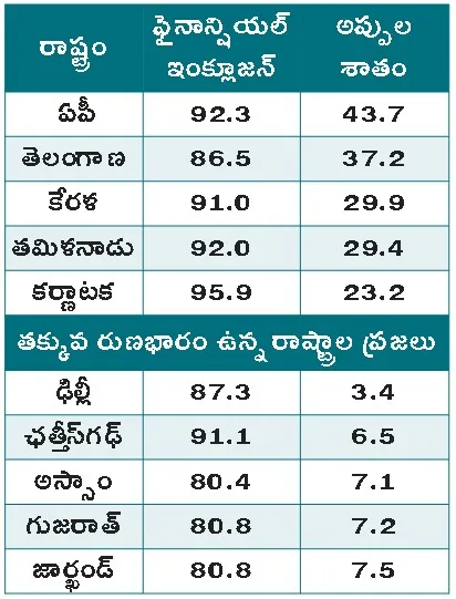 ఏపీలో 43.7శాతం మంది అప్పుల్లో ఉన్నారని ఈ నివేదిక ద్వారా వెల్లడైంది. ఇక కర్ణాటకలో 15 ఏళ్లకు పైబడిన జనాభాలో బ్యాంకింగ్ వ్యవస్థకు అనుసంధానంకాగా ఫైనాన్షియల్ ఇంక్లూ జన్ 95.9శాతం మందితో మొదటిస్థానంలో నిలవగా.. 92.3శాతం మందితో ఏపీ రెండో స్థానాన్ని దక్కిచ్చుకున్నది. అయినా కూడా కర్ణాటక రాష్ట్రంలో కేవలం 23.2శాతం మంది మాత్రమే అప్పుల్లో ఉండగా.. తెలంగాణలో 86.5శాతం మంది ఫైనాన్షియల్ ఇన్క్లూజన్(ఆర్థిక చేరిక) పరిధిలో ఉన్నారు. ఫైనాన్షియల్ ఇన్క్లూజన్లో తెలంగాణ 14వ స్థానంలో నిలిచింది.