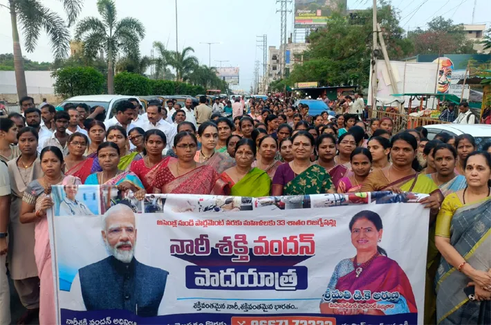 మహిళా బిల్లుకు మద్దతు తెలుపుతూ 966 717 3333 నంబర్ కి మి స్డ్ కాల్ ఇవ్వాలని, తెలంగాణలో 60 నూ తన అసెంబ్లీ స్థానాలు పెరిగితే.. 60 మంది మహిళాలు ఎమ్మెల్యేలు అవుతారన్నారు. అసెంబ్లీ,పార్లమెంట్ లలో మహిళల ప్రతిని ధ్యం పెరిగితే.. మహిళల అభివృద్ధి,రక్షణ, మహిళా సమస్యలపై గొంతు విప్పి అవకా శం వస్తుందని,అవినీతి రహిత పాలన మహి ళతోనే సాధ్యం అవుతుందన్నారు. అన్ని రంగాలలో మహిళలను కేంద్ర ప్రభుత్వం ప్రోత్సహిస్తూ, ఆర్థికంగా బలోపేతం చేస్తుందని తెలిపారు. ఈ కార్యక్రమంలో మహిళలు పాల్గొన్నారు.