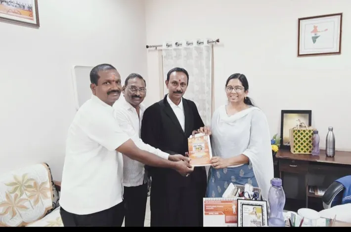 నిజామాబాద్ మార్చ్ 01:(విజయ క్రాంతి) నిజామాబాద్ నగరంలోని హమాల్వాడి లో నూతనంగా న నిర్మిస్తున్న శ్రీ సంతోషిమాత సాయిబాబా ఆలయం ఏప్రిల్ 2వ తేదీ బుధవారం జరిగే పునః ప్రతిష్టాపన మహోత్సవానికి జిల్లా జడ్జి శ్రీమతి సునీత కుంచాల ను బార్ అసోసియేషన్ అధ్యక్షులు మల్లెపూల జగన్ మోహన్ గౌడ్తోకలిసి శ్రీ సంతోషిమాత సాయిబాబా సేవా సమితి అధ్యక్షులు పార్శి కాశీనాథ్ గుప్తా జిల్లా జడ్జి కార్యాలయంలో కలిసి ఆహ్వానించారు.ఇ కార్యక్రమంలోప్రధాన కార్యదర్శి పటేవార్ శ్రీనివాస్ ఆలయ కమిటీ సభ్యులు పాల్గొన్నారు.