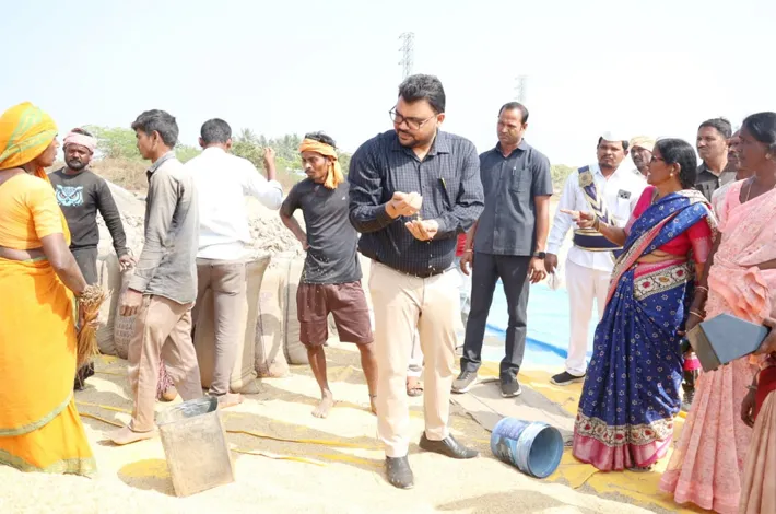 పెద్దకొత్తపల్లి : వరి కొనుగోళ్ల విషయంలో సిబ్బంది నిర్లక్ష్యాన్ని వీడాలని నాగర్ కర్నూల్ జిల్లా కలెక్టర్ దావత్ సంతోష్ అన్నారు. మంగళవారం పెద్దకొత్తపల్లి మండలం సాతాపూర్ గ్రామంలోని మహిళా సంఘాల వరి కొనుగోలు కేంద్రాన్ని పరిశీలించారు. రైతుల నమోదు, తూకం ప్రక్రియ వంటి అంశాలపై వివరాలు అడిగి తెలుసుకున్నారు. రైతులు తీసుకువచ్చిన వరి ధాన్యాన్ని స్వయంగా పరిశీలించి, నాణ్యత, తేమ శాతం వంటి అంశాలపై అరా తీశారు. రైతులకు ఎలాంటి ఇబ్బందులు తలెత్తకుండా కొనుగోలు ప్రక్రియ వేగవంతం చేయాలని తూకంలో పూర్తి పారదర్శకత పాటించాలి.