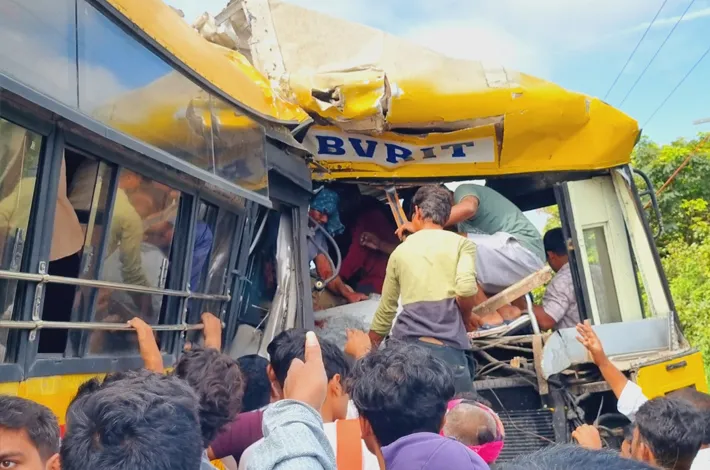 నర్సాపూర్: మెదక్ జిల్లా నర్సాపూర్ శివారులోని శుక్రవారం ఘోర రోడ్డు ప్రమాదం సంభవించింది. బి.వి.ఆర్.ఐ.టి ఇంజనీరింగ్ కళాశాలకు చెందిన రెండు బస్సులు ఢీకొనడంతో డ్రైవర్ మృతి చెందారు. పలువురు విద్యార్థులకు తీవ్ర గాయాలయ్యాయి. క్షతగాత్రులను చికిత్స నిమిత్తం ప్రభుత్వ ఆసుపత్రికి తరలించారు. గాయపడిన వారికి చికిత్స అందిస్తున్నామని వైద్యులు వెల్లడించారు. స్థానికుల సమాచారంతో ఘటనాస్థలికి చేరుకున్న పోలీసులు కేసు నమోదు చేసుకుని మృతదేహాన్ని శవపరీక్ష నిమిత్తం మార్చురీకి తరలించారు.