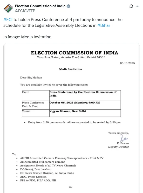 బీహార్లో పారదర్శకంగా, అందరినీ కలుపుకొని శాంతియుతంగా ఎన్నికలు నిర్వహించడానికి మేము పూర్తిగా కట్టుబడి ఉన్నామని సీఈసీ జ్ఞానేష్ కుమార్ అన్నారు. ఈవీఎం నిర్వహణ, పోలింగ్ స్టేషన్ హేతుబద్ధీకరణ, పోల్ సిబ్బందికి శిక్షణ ఇవ్వడం నుండి శాంతిభద్రతల ఏర్పాట్లు, ఓటర్ల అవగాహన ప్రచారాల వరకు ఎన్నికల ప్రణాళిక ప్రతి అంశాన్ని సమీక్షలో పరిశీలించారు. తప్పుడు సమాచారం కోసం సోషల్ మీడియాను నిశితంగా పరిశీలించాలని, అవసరమైనప్పుడు త్వరిత చట్టపరమైన చర్యలు తీసుకోవాలని జిల్లా ఎన్నికల అధికారులు, పోలీసు సూపరింటెండెంట్లను ఆదేశించారు. ఈరోజు ప్రకటనకు ముందు, ఎన్నికల షెడ్యూల్పై వారి సూచనలను కోరేందుకు ఎన్నికల సంఘం బీజేపీ, జెడి(యు), ఆర్జెడి, కాంగ్రెస్, సీపీఐ(ఎంఎల్), ఆప్, ఇతర ప్రధాన జాతీయ, రాష్ట్ర రాజకీయ పార్టీల ప్రతినిధులను కూడా కలిసింది. బీహార్లో అతి ముఖ్యమైన పండుగ అయిన ఛత్ పూజ తర్వాత పోలింగ్ నిర్వహించాలని అనేక పార్టీలు కమిషన్ను కోరాయి.