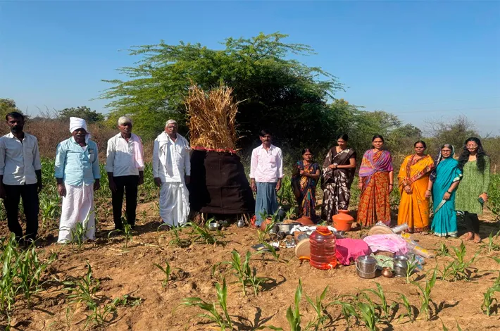 మట్టి కుండలో అంబలి పోసి, ఆ కుండకు మంగళసూత్రం లేదా ముత్యాల హారం కడతారు. ఇదో సంప్రదాయంగా వారు భావిస్తారు. తూర్పు దిశలో పాలు పొంగితే పంటలు సమృద్ధిగా పండుతుందని భావించి, పాలు పొంగిస్తారు. మగవాళ్లు మాత్రం ఒలిగ్యో ఒలిగ్యా సాలం పాలిగ్యా అంటూ గుడి చుట్టూ ప్రదక్షిణలు చేస్తారు. జొన్న గుడిలోనే ఓ గొయ్యి తవ్వి అంబలి, అన్నంతో ఉన్న మట్టి కుండను మూస్తారు. పంట దిగుబడి వచ్చే సరికి మళ్లీ ఆ కుండను వెలికి తీసి దిగుబడిని అదే కుండలో నింపి ఇంటికి తీసుకురావడం ఇక్కడ ఆనవాయితీగా వస్తోంది. ప్రతీదీ వినూత్నమే : కట్టుకున్న భర్త కట్టిన తాళిని మెడలో నుంచి తీసి మట్టి కుండకు మంగళసూత్రం కట్టే సంప్రదాయం ఆలోచింపజేస్తోంది.