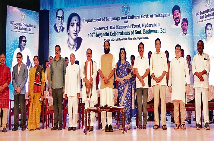 హైదరాబాద్ సిటీబ్యూరో, డిసెంబర్ 1 (విజయక్రాంతి): రవీంద్రభారతిలో భాషా, సాం స్కృతిక శాఖ, ఈశ్వరీబాయి మెమోరియల్ ట్రస్ట్ సంయుక్త ఆధ్వర్యంలో ఆదివారం ఈశ్వరీబాయి జయంతి కార్యక్రమం ఘనంగా నిర్వహించారు. కార్యక్రమంలో మంత్రులు ఉత్తమ్ కుమార్రెడ్డి, శ్రీధర్బాబు, పొన్నం ప్రభాకర్, జూపల్లి కృష్ణారావు, ఎమ్మెల్యే సామేలు, పీసీసీ అధ్యక్షుడు మహేశ్కుమార్ గౌడ్, జస్టిస్ చంద్రయ్య, ఈశ్వరీబాయి కుమార్తె, కాంగ్రెస్ పార్టీ సీనియర్ నాయకురాలు గీతారెడ్డి తదితరులు పాల్గొని ఈశ్వరీ బాయి చిత్రపటం వద్ద నివాళులర్పించారు.