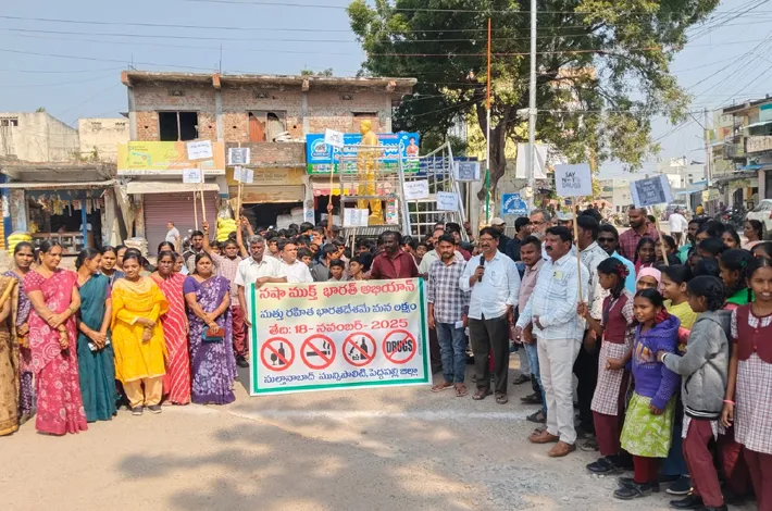 సుల్తానాబాద్ (విజయక్రాంతి): మత్తు పదార్థాలకు ప్రతి ఒక్కరు దూరంగా ఉండాలని సుల్తానాబాద్ మునిసిపల్ కమిషనర్ రమేష్, మండల విద్యాధికారి ఆరెపల్లి రాజయ్యలు పిలుపునిచ్చారు. మంగళవారం సుల్తానాబాద్ మున్సిపాలిటీ పరిధిలో మున్సిపల్ కమిషనర్ టి. రమేష్ ఆధ్వర్యంలో “నషా ముక్త భారత్ అభియాన్ (ఎన్ ఎం బి ఏ )” కార్యక్రమాన్ని ఘనంగా నిర్వహించారు. కేంద్ర సామాజిక న్యాయం సాధికారత మంత్రిత్వ శాఖ మార్గదర్శకాల మేరకు దేశాన్ని మాదక ద్రవ్యాల బెడద నుండి దూరంగా ఉంచి “డ్రగ్స్ ముక్త భారత్*”గా తీర్చిదిద్దడం లక్ష్యంగా ఈ కార్యక్రమాన్ని నిర్వహించారు. ఈ సందర్భంగా మున్సిపల్ సిబ్బంది, మెప్మా సిబ్బంది, ఆర్పీలు, ప్రభుత్వ స్కూల్ విద్యార్థులతో నెహ్రూ చౌక్ నుండి మున్సిపల్ కార్యాలయం వరకు ర్యాలీ నిర్వహించారు.ర్యాలీ అనంతరం, పాల్గొన్న వారందరికీ “మాదక ద్రవ్యాల నిరోధక ప్రతిజ్ఞ” చేయించారు.