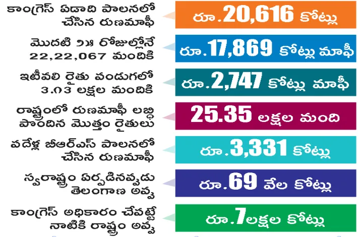 * దేశంలో ఏ రాష్ట్రం చేయలేని విధంగా మా ప్రభుత్వం తక్కువ సమయంలో రూ.౨౦,౬౧౬ కోట్ల రుణమాఫీ చేసింది. 25 రోజుల్లో 22,22,067 మంది రైతులకు రూ.17,869 కోట్లు రుణమాఫీ చేశాం. ఇటీవల మరో ౩.౧౩ లక్షల మందికి రూ.2,747 కోట్లు మాఫీ చేశాం. దేశంలో ఇది ఓ గొప్ప రికార్డు.
