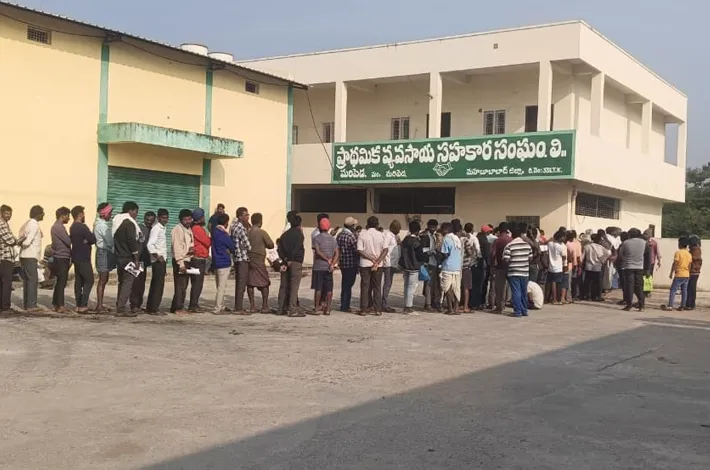 మరిపెడ సొసైటీ వద్ద బారులు తీరిన రైతులు