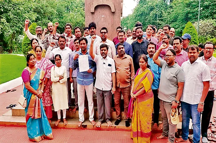 -అమరవీరుల స్థూపం ఎదుట పెద్ద ఎత్తున నిరసన చేపట్టిన అధ్యాపకులు