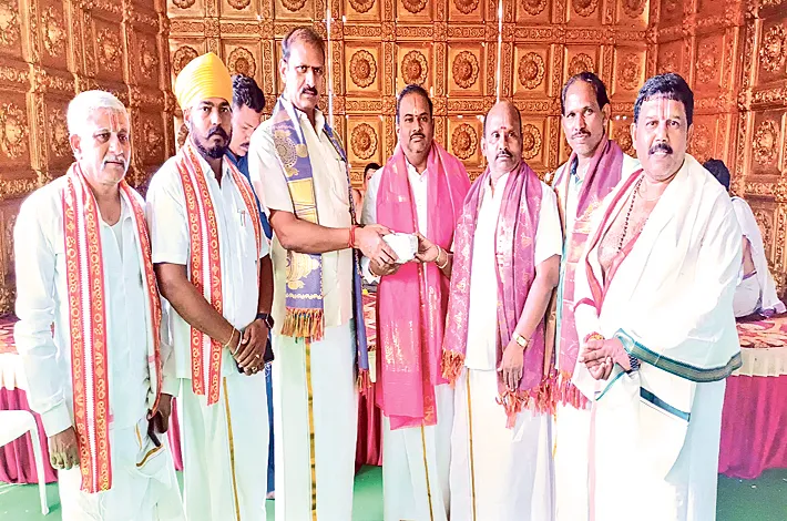 కొత్తపల్లి, ఫిబ్రవరి6: వెంకటే శ్వర స్వామి బ్రహ్మోత్సవాల సం దర్భంగా అయిదు లక్షల రూపా యలు వ్యవస్థాపక వంశీయ ధర్మ కర్తలు అయిన చకిలం శ్రీనివాస్, చకిలం గంగాధర్లకు అందజే సిన సుడా చైర్మన్ కోమటిరెడ్డి నరేందర్ రెడ్డి