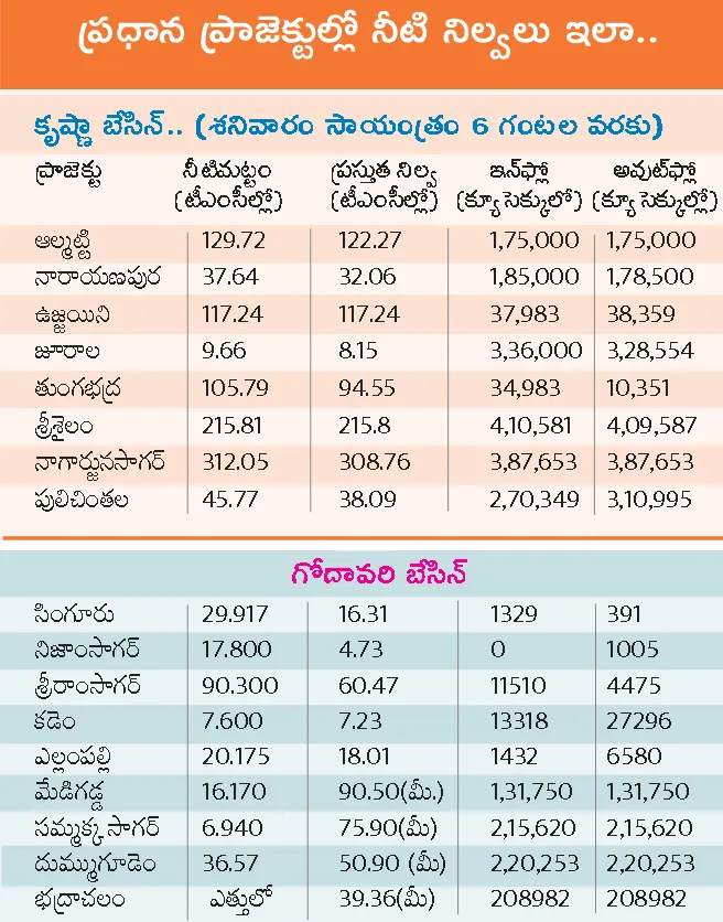హైదరాబాద్/నాగర్కర్నూల్/వనపర్తి/నిర్మల్(విజయక్రాంతి), చర్ల, ఆగస్టు 31: కృష్ణాబేసిన్లో ప్రాజెక్టులకు వరద ఉధృతి కొనసాగుతోంది. కర్ణాటక, మహారాష్ట్రలో కు రుస్తున్న భారీ వర్షాల ప్రభావంతో ఆల్మ ట్టి, నారాయణపూర్ నుంచి జూరాలకు భారీగా వరద వస్తున్నది. ఇక కృష్ణా ఉప నదులైన భీ మా, తుంగభద్రకు సైతం వర ద ప్రభావం భారీగానే ఉంది. జూరాలకు 3.36 లక్షలు, శ్రీశైలానికి 4.10 లక్షలు, సాగర్కు 3.87 ల క్షల క్యూసెక్కుల వరద కొన సాగుతోంది. ఎ గువ నుంచి వచ్చిన వరదను వచ్చినట్లుగా దిగువనకు వదులుతు న్నారు. కడెం ప్రాజెక్టు 4 గేట్లను ఎత్తి నీటిని గోదావరిలోనికి విడుదల చేస్తున్నారు. భద్రాద్రి కొత్తగూడెం జిల్లా చర్ల మండలంలోని తాలిపేరు ప్రాజెక్టుకు భా రీగా వరద నీరు వచ్చి చేరుతోంది. అధికారు లు 22 గేట్లు ఎత్తి వరద నీటిని దిగువనున్న గోదావరిలోకి వదులుతున్నారు.