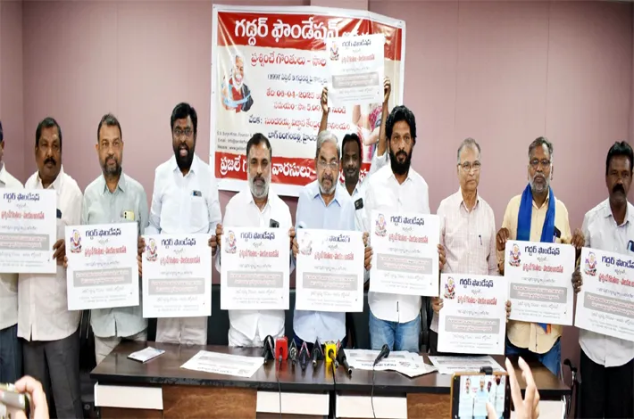 మలి దశ ఉద్యమాన్ని ఉరకలెత్తించిన ఘనత గద్దర్కే దక్కిందన్నారు. తన పాటల ద్వారా ఎంతో మందిలో ఉత్తేజం కలిగించి, ఉద్యమానికి ఊపిరి పోశారన్నారు. పెద్దెత్తున గద్దర్ అభిమానులు పాల్గొని విజయవంతం చేయాలని పిలుపునిచ్చారు. ఈ కార్యక్రమంలో ఎంవీ ఫౌండేషన్ వెంకట్ రెడ్డి, వినయ్ శంకర్, శ్రీరాములు, పృథ్వీరాజ్ తదితరులు పాల్గొన్నారు.