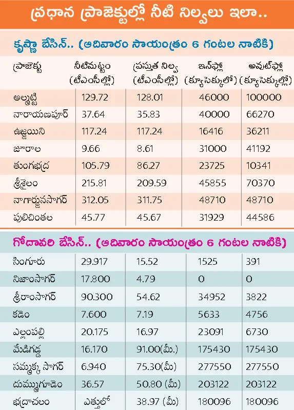 ఆదివారం ఉదయం 65 వేల క్యూసెక్కులకు పైగా ఇన్ఫ్లో రావడంతో ప్రాజెక్టు అధికారులు రెండు క్రస్టు గేట్లను ఎత్తి దిగువకు నీటిని వదిలారు. మధ్యాహ్నం 12 గంటల తర్వాత వరద తగ్గడంతో గేట్లను మూసేశారు. కుడి కాల్వకు 9,076 క్యూసెక్కులు, ఎడమ కాల్వకు 8,367 క్యూసెక్కులు, ఎస్సెల్బీసీ (ఏఎమ్మార్పీ)కి 1800 క్యూసెక్కులు, లో లెవల్ కెనాల్కు 600 క్యూసెక్కులు, ప్రధాన జల విద్యుత్ కేంద్రంలో విద్యుదుత్పత్తి కొనసాగిస్తూ 28,867 క్యూసెక్కుల జలాలను దిగువకు విడుదల చేస్తున్నారు. రిజర్వాయర్లోకి 48,710 క్యూసెక్కుల వరద వచ్చి చేరుతుండగా.. అంతే మొత్తంలో అవుట్ ఫ్లో కొనసాగుతున్నది.