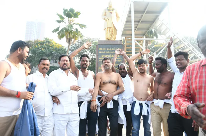రాష్ట్ర ప్రభుత్వం తీసుకొచ్చిన 46 జీవోను తక్షణమే రద్దు చేసి, సర్పంచుల ఎన్నికలను వాయిదా వేయాలని డిమాండ్ చేస్తూ బుధవారం బషీర్ బాగ్ చౌరస్తా లోని బాబు జగ్జీవన్ రామ్ విగ్రహం వద్ద జాతీయ బీసీ సంక్షేమ సంఘం నాయకులు వినూత్న తరహాలో నిరసన చేపట్టారు. సంఘం నేతలు నీల వెంకటేష్ ముదిరాజ్, జిల్లపల్లి అంజి నేతృత్వంలో అర్ధనగ్న ప్రదర్శన చేపట్టి నిరసన వ్యక్తం చేశారు.