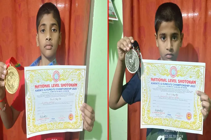 సత్తుపల్లి (విజయక్రాంతి): వరంగల్ జిల్లా నర్సంపేటలో, ఫిబ్రవరి 2వ తేది ఖమ్మంలో జరిగిన నేషనల్ కరాటే ఛాంపియన్ షిప్ పోటీలలో సత్తుపల్లి మండలం యాతాల కుంట గ్రామానికి చెందిన చీకటి వసంత రావు, రజని దంపతుల కుమారులు కరాటేలో కట్టా విభాగంలో గోల్డ్ మెడల్ సాధించారు. ఈ సందర్భంగా విద్యార్థులకు కరాటే కోచ్ పిచ్చియ్య, ఉపాధ్యాయులు సోమవారం అభినందించారు. ఈనెల 2వ తేదీన ఖమ్మంలో జరిగిన కరాటే పోటీలో సిల్వర్ మెడల్ సాధించారు. స్థానిక లైన్ బుడోకాన్ కరాటే హెల్త్ క్లబ్ నిర్వాహకులు వి.పిచ్చయ్య వద్ద శిక్షణ పొందుతున్నారు. కరాటే మాస్టర్ పిచ్చయ్యకు ఉపాధ్యాయులు కృతజ్ఞతలు తెలిపారు. కరాటేలో అతి చిన్న వయసులోనే గోల్డ్, సిల్వర్, మెడల్స్ సాధించటం విశేషం అని తల్లిదండ్రులని అభినందించారు.