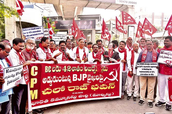 హైదరాబాద్, సిటీ బ్యూరో, అక్టోబర్ 17 (విజయక్రాంతి): స్థానిక సంస్థల్లో బీసీలకు 42% రిజర్వేషన్లు కల్పించే బిల్లుపై నెలకొన్న ప్రతిష్టంభనపై సీపీఎం నేతలు ఆందోళనకు దిగారు. గవర్నర్ వద్ద పెండింగ్లో ఉన్న బీసీ రిజర్వేషన్ల బిల్లును తక్షణమే ఆమోదించాలని డిమాండ్ చేస్తూ సీపీఎం నాయకులు శుక్రవారం రాజ్భవన్ను ముట్టడించారు. గవర్నర్కు వినతిపత్రం సమర్పించేందుకు సీపీఎం నాయకులు ప్రయత్నించగా, పోలీసులు వారిని అడ్డుకున్నారు.