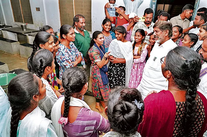మొదట విద్యార్థినిల అందరితో స్థానిక ఎమ్మెల్యే రాం దాస్ నాయక్ తో కలిసి ప్రత్యేకంగా సమావేశం అయ్యారు. సుమారు 500 మంది విద్యార్థినీలతో వారు సమావేశం అయ్యారు. రాత్రివేళ హాస్టల్లో డ్యూటీలో ఎవరు ఉం టారు? వారు ఎక్కడ పడుకుంటారు? డిన్న ర్ టైమింగ్స్ ఏంటి? ఇప్పుడు భోజనం చేద్దామా? హాస్టల్లో ఇబ్బందులు ఏమైనా ఉన్నాయా? అంటూ విద్యార్థినీల నుంచి పలు విషయాలు అడిగి తెలుసుకున్నారు.