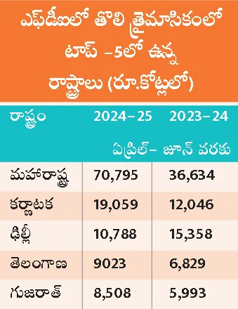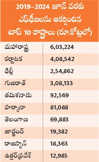 దేశంలో విదేశీ ప్రత్యక్ష పెట్టుబడులను ఆకర్షిస్తున్న రాష్ట్రాల్లో మహారాష్ట్ర అగ్రస్థానంలో ఉంది. గతేడాదితో పోలిస్తే పెరిగిన శాతంలో కూడా మహారాష్ట్రనే అగ్రస్థానంలో నిలిచింది. ఇదిలా ఉంటే.. 2019 24 జూన్ వరకు వచ్చిన మొత్తం ఎఫ్డీఐల జాబితాలోనూ తెలంగాణ టాప్ 10లో నిలిచింది. రూ.69,883 కోట్లతో ఏడో స్థానంలో నిలిచినట్లు కేంద్ర గణాంకాలు చెబుతున్నాయి.