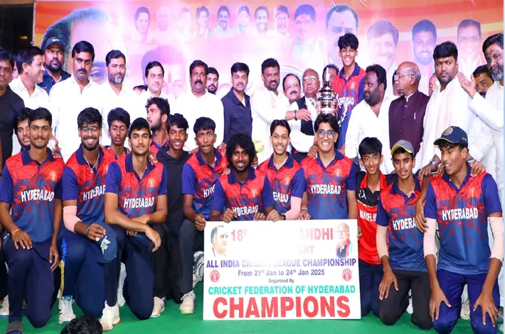 హైదరాబాద్: ఆలిండియా 47వ రాజీవ్ గాంధీ టీ20 క్రికెట్ టోర్నీ(47th All India Rajiv Gandhi T20 Cricket Tournament) విజేతగా హైదరాబాద్ నిలిచింది. విజేతగా నిలిచిన హైదరాబాద్కు క్రికెట్ ఫెడరేషన్ ఆఫ్ ఇండియా చైర్మన్ వీ హనుమంతరావు(Cricket Federation of India Chairman V Hanumantha Rao) ట్రోఫీతో పాటు ప్రైజ్మనీ అందించారు. కార్యక్రమంలో తెలంగాణ స్పోర్ట్స్ అథారిటీ చైర్మన్ శివసేనారెడ్డి, మాజీ క్రికెటర్ ఎమ్మెస్కే ప్రసాద్, శ్రీకాంత్ గౌడ్ , రజనీకాంత్, అవినాశ్ తదితరులున్నారు. మ్యాచ్లో హైదరాబాద్ 35 పరుగుల తేడాతో చెన్నైపై గెలుపొందింది.