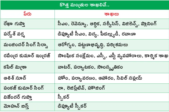 ప్రస్తుతానికి రెవెన్యూ శాఖ రేఖా గుప్తా వద్దే ఉండ గా.. డిప్యూటీ సీఎం పర్వేశ్ వర్మ వద్ద విద్య, పీడబ్ల్యుడీ, రవాణా వంటి శాఖలు ప్రమాణ స్వీకార కార్యక్రమానికి కేంద్ర హోం మంత్రి అమిత్ షా, రక్షణ శాఖ మంత్రి రాజ్నాథ్ సింగ్, ఏపీ సీఎం చంద్రబాబు, మహారాష్ట్ర సీఎం దేవేంద్ర ఫడ్నవీస్, హర్యానా ముఖ్యమంత్రి నాయ బ్ సింగ్ సైనీ, ఏపీ డిప్యూటీ సీఎం పవన్ కల్యాణ్, ఎన్డీయే పాలిత సీఎంలు, డిప్యూటీ సీఎంలు, తదితర ముఖ్యనేతలు హాజరయ్యారు. గురువారం నూతన క్యాబినేట్ భేటీ అయి పలు నిర్ణయాలు ప్రకటించింది.