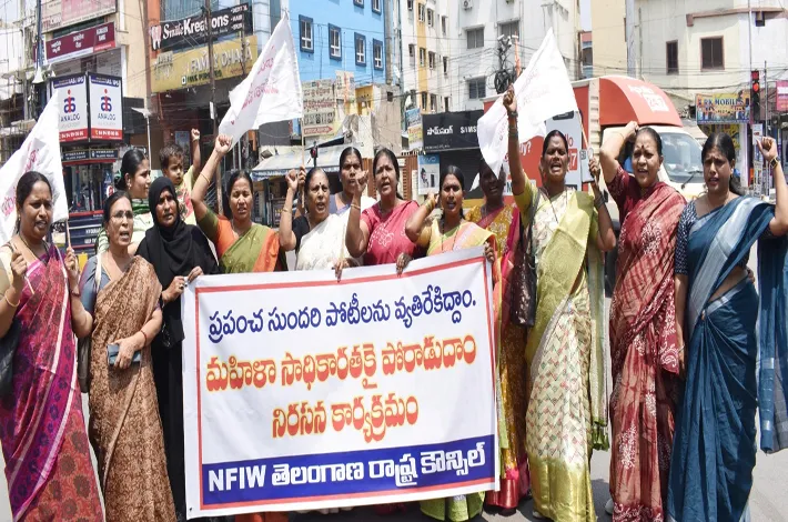 ఎన్ఎఫ్ఐడబ్ల్యూ హైదరాబాద్ జిల్లా అధ్యక్షులు, ప్రధాన కార్యదర్శి పడాల నళిని, ఎస్.ఛాయాదేవి లు మాట్లాడుతూ అం దాల పోటీలను వెంటనే రద్దు చేయాలనీ లేనిపక్షంలో మే 7 నుండి 31 వరకు జరిగే ఈ పో టీలను అడుగడునా అడ్డుకుంటామని హెచ్చరించారు. ఈ ప్రదర్శనలో ఎన్ఎఫ్ఐడబ్ల్యూ రాష్ట్ర సహాయ కార్యదర్శి ఫైమీద, నాయకురాళ్లు ఎన్.కరుణ కుమారి, జ్యోతి శ్రీమాన్, షహనా అంజూమ్, రొయ్యల గిరిజ, ఎం.లక్ష్మి తదితరులు పాల్గొన్నారు.
