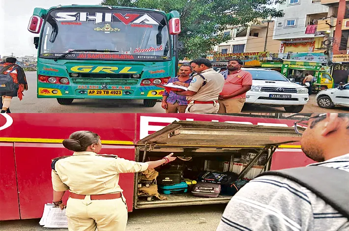 రాజేంద్ర నగర్ పరిధి గగన్ పహాడ్ వద్ద సోదాలు చేశారు. ఏపీ నుంచి ఇతర ప్రాంతాల్లో నుంచి వచ్చే బస్సులను క్షుణ్ణంగా తనిఖీలు చేశారు. బస్సుల్లోని ఫైర్ సేఫ్టీ, మెడికల్ కిట్లు, అగ్నిమాక యంత్ర పరికరాలను పరిశీలిం చారు. జడ్చర్ల వద్ద రోడ్డు ప్రమాదానికి గురై అద్దం పగిలిన ఓ ట్రావెల్స్ బస్సును అలాగే నడుపుతుండటంతో దానిని అధికారులు సీజ్ చేశారు.