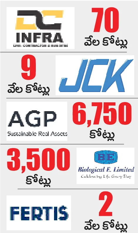 ఇన్ఫ్రాకీ డీసీ పారక్స్ 150 ఎకరాల్లో 1 గిగావాట్ సామర్థ్యం గల భారీ డేటా పార్క్ అభివృద్ధి చేపట్టేందుకు రూ. 70 వేల కోట్ల పెట్టుబడులతో ముందుకొచ్చిం ది. జేసీకే ఇన్ఫ్రా ప్రాజెక్ట్స్ లిమిటెడ్ రూ.9 వేల కోట్లతో డేటా సెంటర్లు, ఏజీపీ గ్రూప్ రూ. 6,750 కోట్ల పెట్టుబడితో 1 గిగావాట్ డేటా సెంటర్ను ఏర్పాటు చేయ నుంది. బయోలాజికల్ ఈ లిమిటెడ్ (బీఈ) టీకాలు, పరిశోధన-అభివృద్ధి, తయారీ సేవల విస్తరణలో భాగంగా రూ. 3,500 కోట్ల పెట్టుబడి ద్వారా 3 వేల మందికి ఉద్యోగాలు రాబోతున్నాయి.